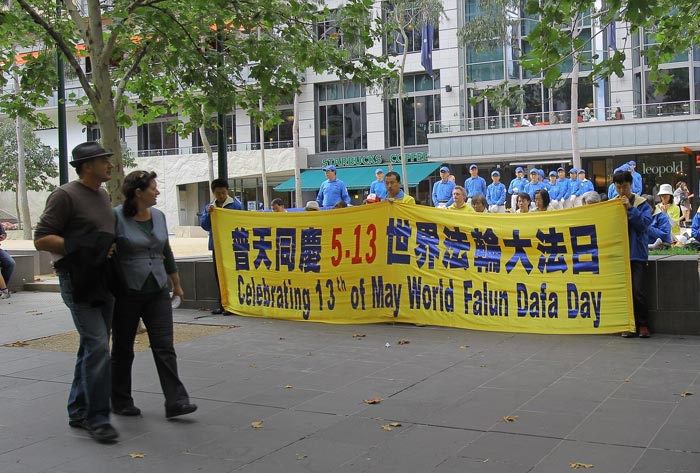 下午2点开始,庆贺活动在墨尔本城市中心广场开始,天国乐团是主角,他们在历次游行和各种纪念活动中亮相,早已被当地民众所熟悉。天国乐团成员训练有素,身着统一服装,天蓝色上衣给人清纯、明快的印象。大鼓、军鼓、长号、黑管等乐器一应俱全,乐声高亢嘹亮,雄壮的鼓声震撼人心,「法轮大法好」的音乐,散发着慈悲的能量,吸引民众停下脚步观看,并发出喝彩赞叹声,过往行人拿出相机拍摄下这一历史镜头。