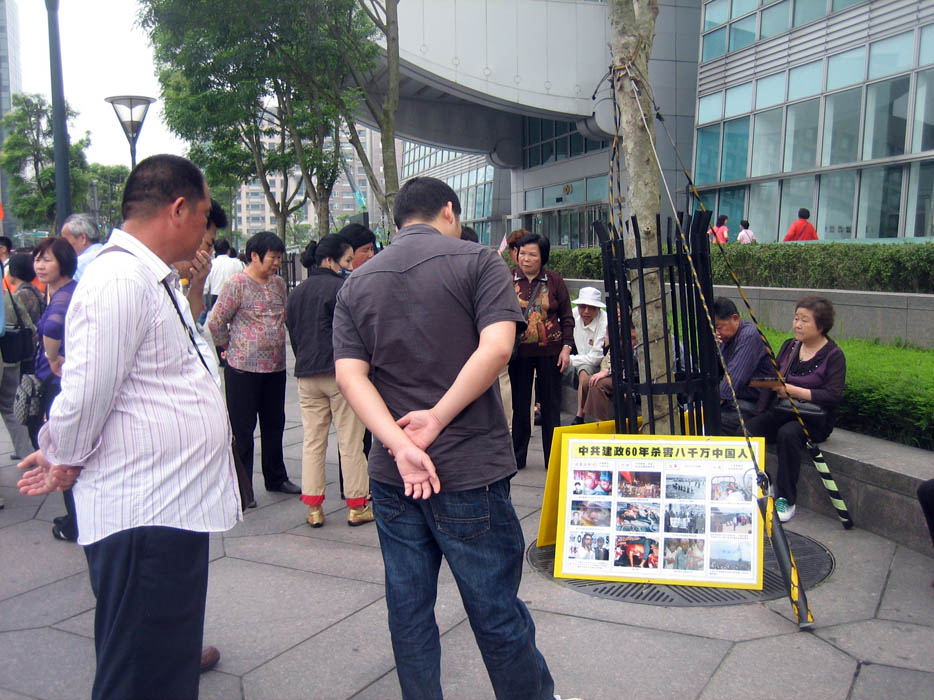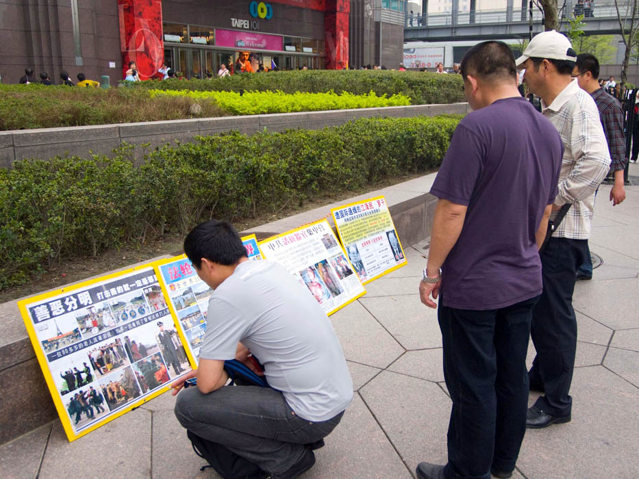 ![]() 大陆游客仔细看着各种法轮功真相展板 |