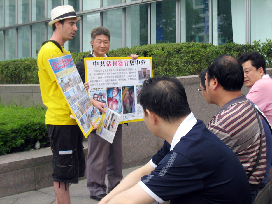 ![]() 大陆游客看着黄涵手上的法轮功真相展板 |