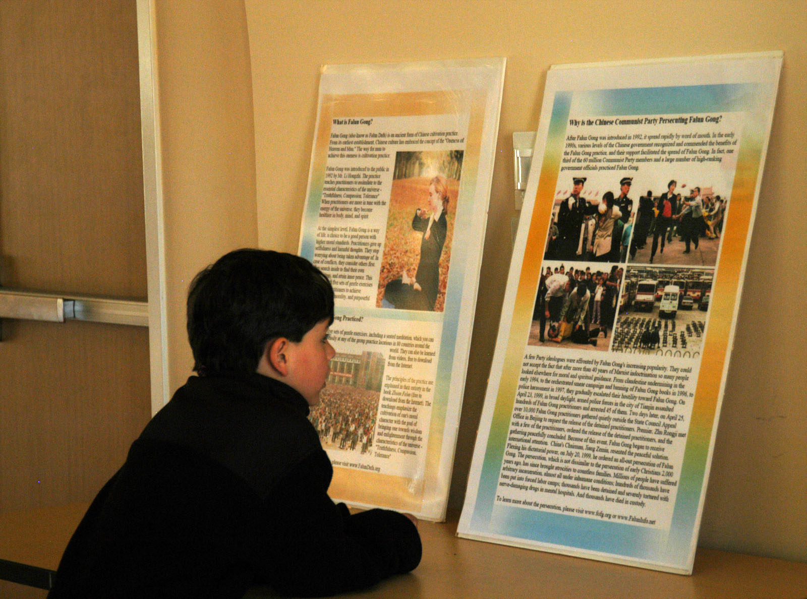 ![]() 这位男孩仔细阅读在展厅一侧的关于法轮功的简介 |