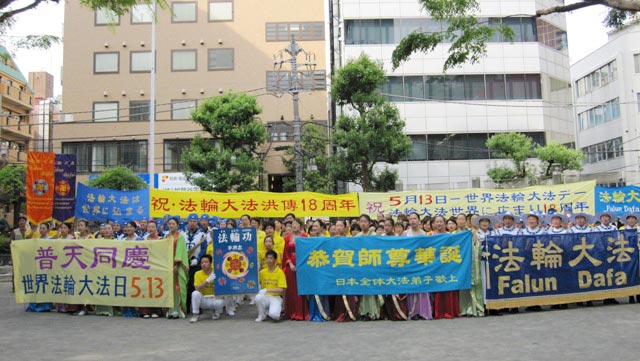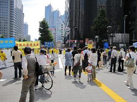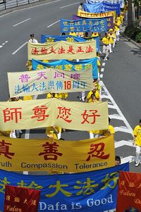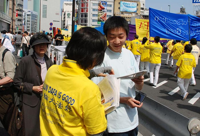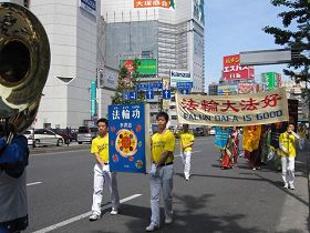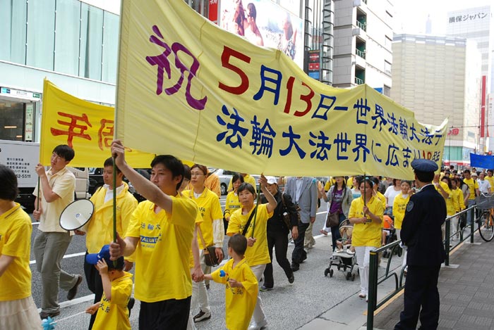 下午一点半,游行队伍从东京市中心的新宿区的柏木公园出发,天国乐团成员身着唐装,演奏着“法轮大法好”等乐曲为先导,随后是手持“法轮大法好”、“普天同庆5.13日法轮大法日”、“祝法轮大法洪传18周年”、“恭祝师尊华诞”等各种中日文横幅的队伍,身穿法轮功黄色体恤及白色裤子的炼功方阵在其后。游行的沿途,有的学员向民众派发法轮功简介。队伍经过之处,充满喜洋洋、乐融融的气氛。