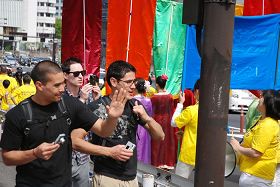 经营一家商店的石井女士手里拿着法轮功资料,看着眼前经过的游行队伍,不禁啧啧称赞:“真壮观,这样的喜庆热闹,听到声音人们都出来观看,这么多中国人,这样友好平和,还有日本人,这个游行太好了。”