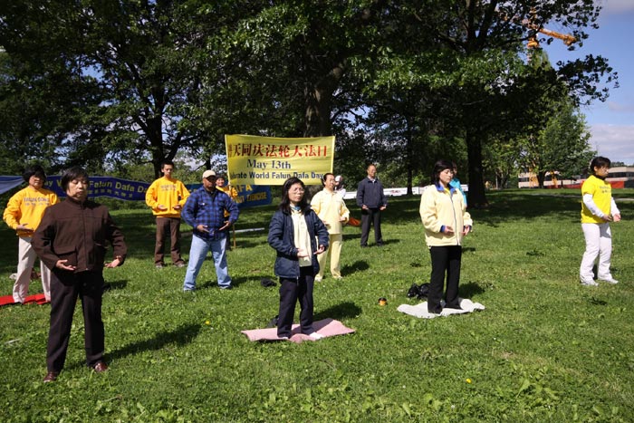 周末的森林公园异常热闹,来往的很多行人驻足观看学员们的集体炼功和摆放在路边的早期中国大陆大型集体炼功的珍贵照片。法轮功,又称法轮大法,是以“真善忍”为根本指导,使修炼者能够返本归真的高层次修炼法门。一九九二年五月十三日,由李洪志先生在中国长春第一次把大法公开传出。如今,大法洪传一百一十多个国家和地区,载誉无数。亿万修炼者返本归真, 获益无穷。五月十三日被定为“世界法轮大法日”,以便全世界大法修炼者和善良民众共同欢庆。