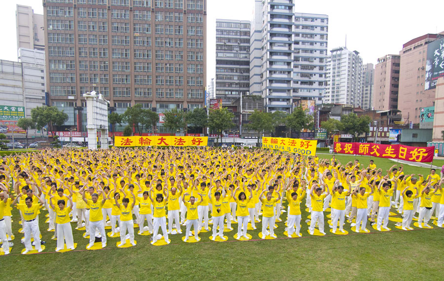 ![]() 二零一零年五月八日,近千名台湾桃竹苗的法轮功学员聚集在桃园中坜市的中正公园庆祝世界法轮大法日 |