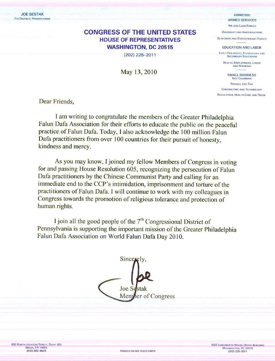 我要在二零一零年法轮大法日,同宾夕法尼亚第七议会选区的所有善良民众一起,支持大费城法轮大法学会的宗旨和理念。