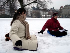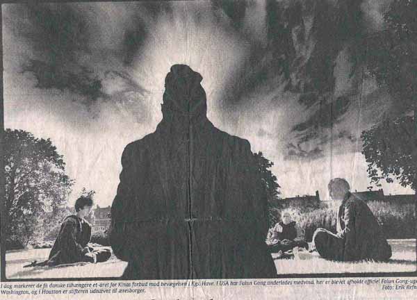 ![]() 二零零零年七月,丹麦报纸《贝林时报》报道法轮功,图为学员在国王公园炼功 |