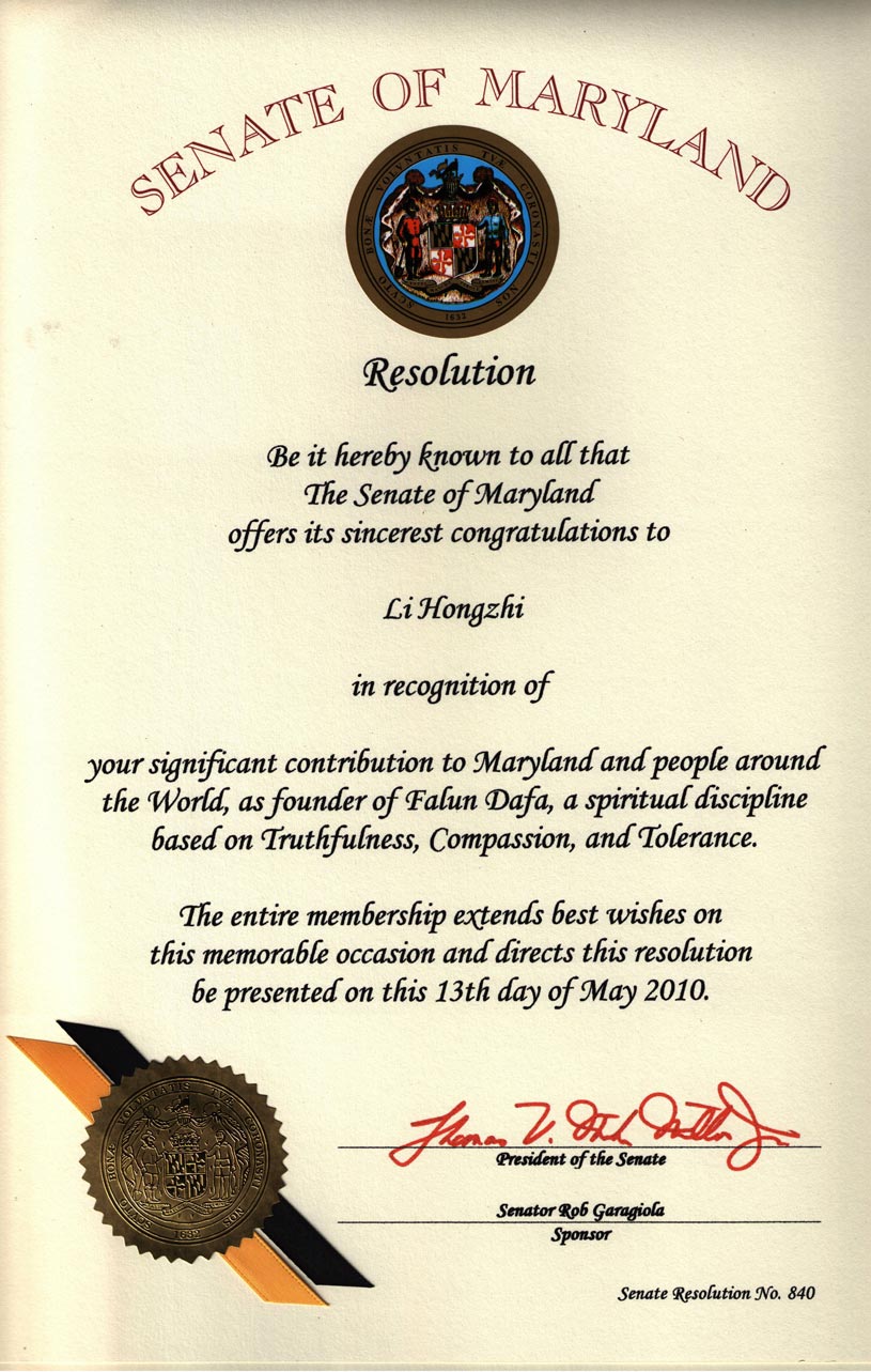 马里兰州参议院向李洪志先生致以诚挚的祝贺,表彰您作为基于真、善、忍原则的法轮大法的创始人,对马里兰州及全世界人民的重大贡献。