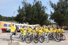 ![]() 法轮功学员骑着插有“法轮大法好”黄色旗子的单车,弘扬法轮大法,受到游客热烈欢迎,尤其大陆游客争相拍照留念。 |