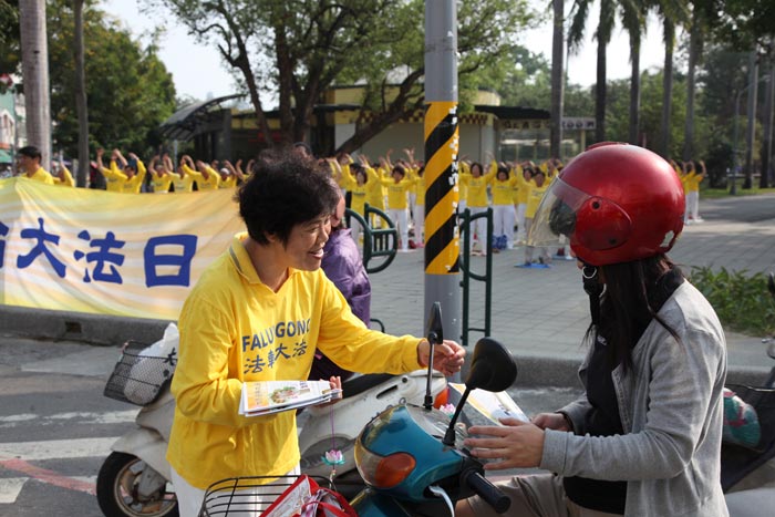 十三日,上百位身着“法轮大法好”黄色上衣的屏东法轮功学员齐聚中山公园,演示功法,随后各学员到附近商家发特刊及分享大法的美好。