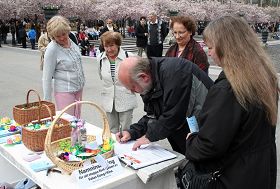 这天正值国王花园樱花盛开的时节,来这里赏花的人们络绎不绝,不少瑞典人被法轮功的炼功音乐和舒缓的动作所吸引,加入到学习功法的队伍中。