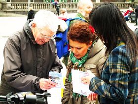 一对来自加拿大的华人夫妇听了法轮功学员的介绍后说:“我们知道中共在迫害法轮功,但一直不清楚法轮功是一个什么样的功法,中共为什么要迫害法轮功。今天终于解开了内心的疑团。”他们记下了法轮大法网站的详细地址。