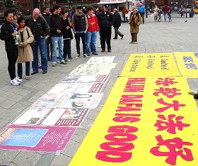 ![]() 路人驻足阅读法轮功真相图片资料 |