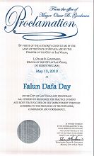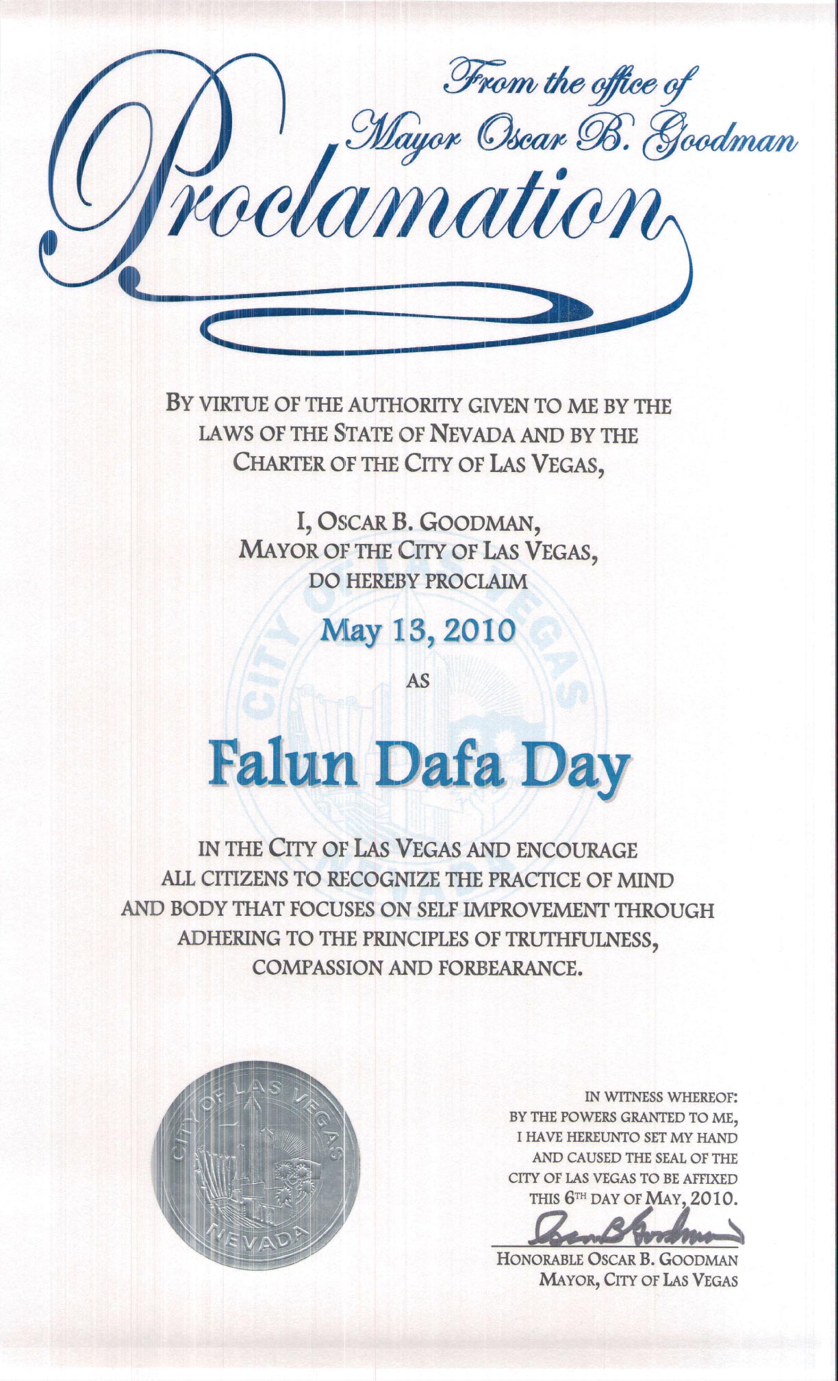 我以内华达州拉斯维加斯市法律授予我,奥斯卡·古德曼市长的身份,宣布二零一零年五月十三日为拉斯维加斯市法轮大法日,我鼓励全市市民认同这一以真善忍为原则修心养性自我升华的修炼方法。