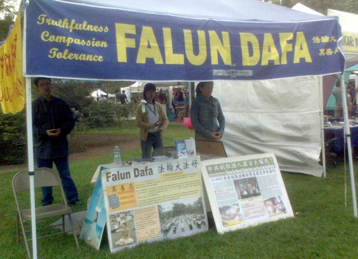 ![]() 法轮功学员在加州大学“地球日”庆祝活动中设立摊位,传播大法“真善忍”的美好。 |