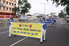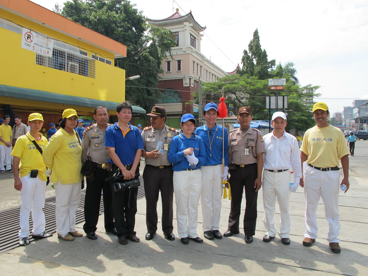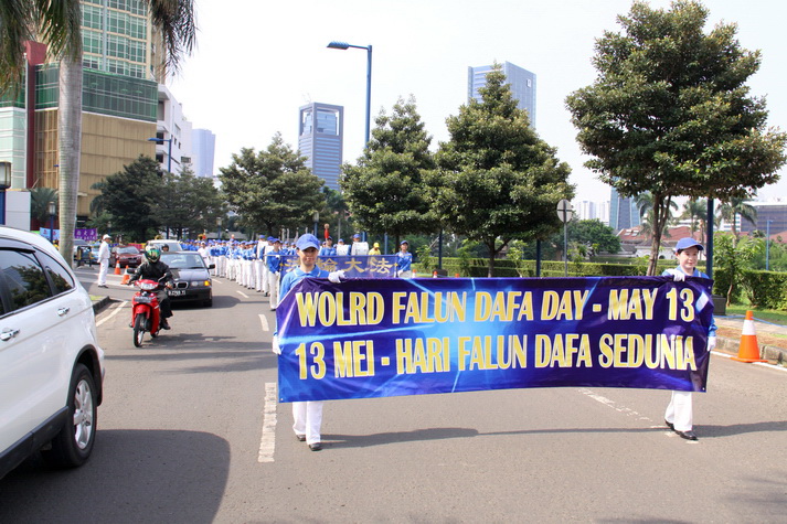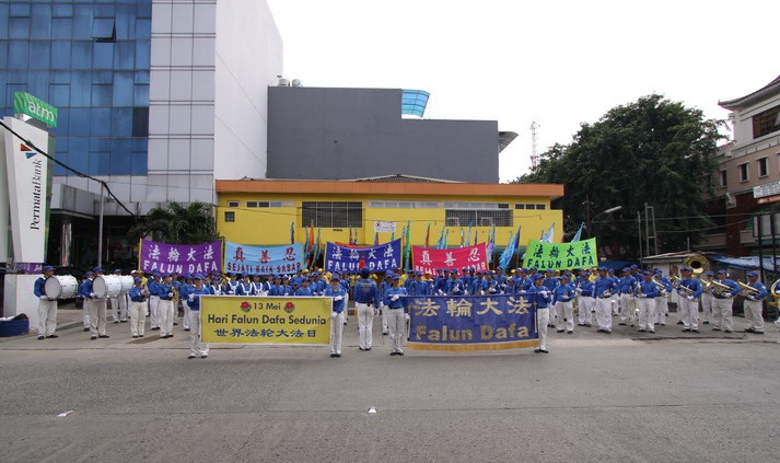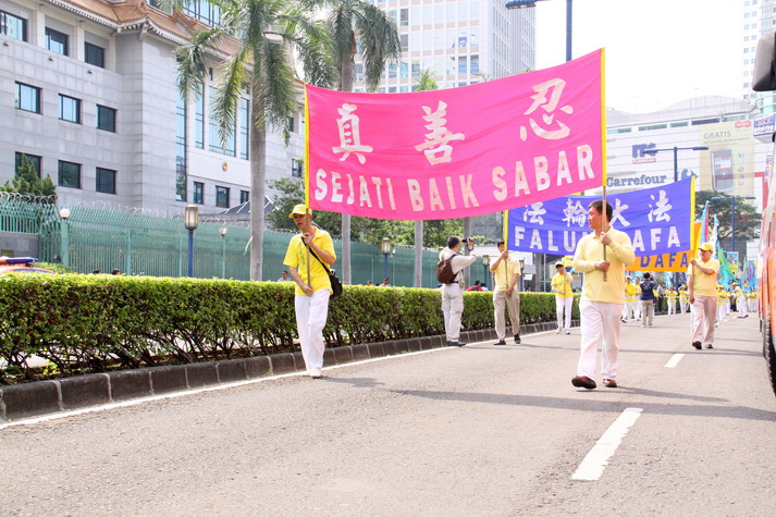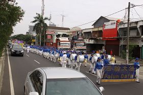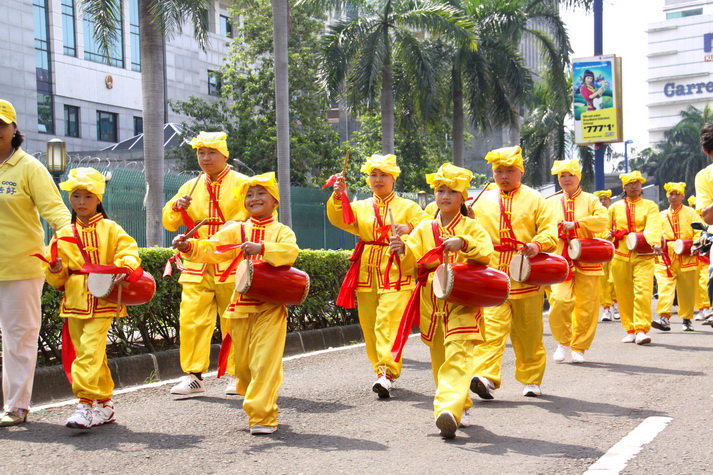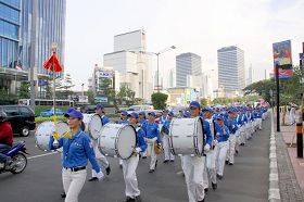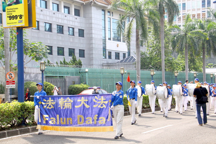 早上游行开始之前,看着天国乐团正在排练的一位警察,向站在他旁边的学员说,“他们走了五公里!”警察所谓五公里是指前一天所走的路程,他这两天负责开道护送,和队伍一起从中共使馆前,一直到印尼大酒店的喷水池旁,在艳阳天底下晒了两个小时,走了五公里远,而警察们是坐着车辆走,今天是第二天,一大早又再游行,警察有感而发地说了这句话。