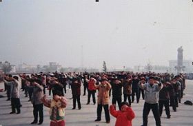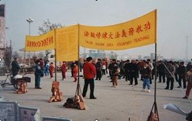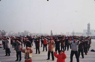 每天的早晨,不分寒暑,在火车站广场、在小公园,晨曦中伴着祥和的音乐,法轮功学员在一起舒缓的炼功。这两张照片是枣强法轮功学员九八年在火车站广场洪法、炼功时的场景。