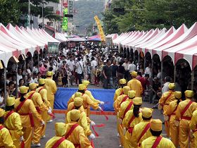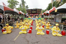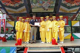 法轮功学员向与会观众分发法轮大法简介资料,并展示五套功法,深受乡亲欢迎。腰鼓队表演也让活动增添无限光彩。法轮功学员真诚地希望将法轮大法的美好和“真、善、忍”的福音传递给旗山乡亲。