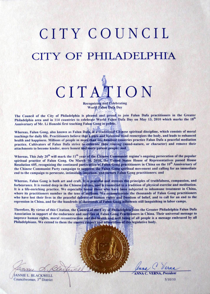 因此,谨借此褒扬信,费城市议会同大费城地区法轮大法学会支持中国的法轮功学员的坚毅和献身精神。他们改善所有民众的人权、提升道德、强身健体的普世理念也为所有费城人所赞赏。我们全体立法人士向他们致以诚挚的敬意和钦佩。
