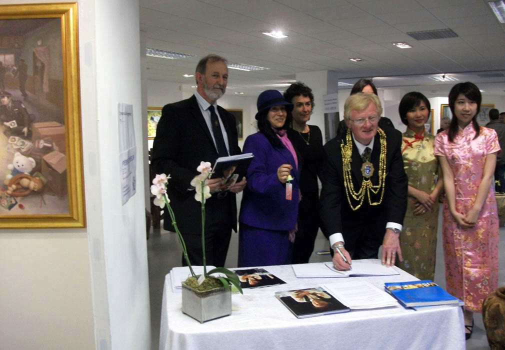 ![]() “真善忍国际美展”在英国布莱顿市展出,市长杰夫•韦尔斯先生(右三)参加开幕式。 |