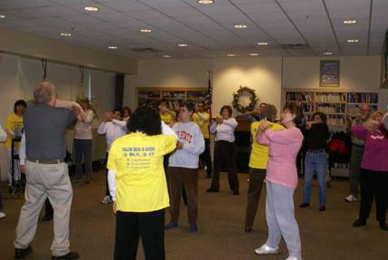 一月九日上午,教功班正式开始。首先法轮功学员介绍什么是法轮功和在全世界洪传的情况,强调说明法轮功是性命双修的功法,除了炼功,还需要阅读指导修炼的书《转法轮》,并在日常生活中按照“真、善、忍”的原则要求自己,提高心性,才会使自己得到更快的提高;同时也谈到了法轮功在中国大陆无辜遭受的打压和迫害。教功时,先放教功录像,然后由学员手把手地教动作。为了方便人们学功学法,学员们还准备了一些炼功音乐光盘和《法轮功》书籍供人们借阅。
