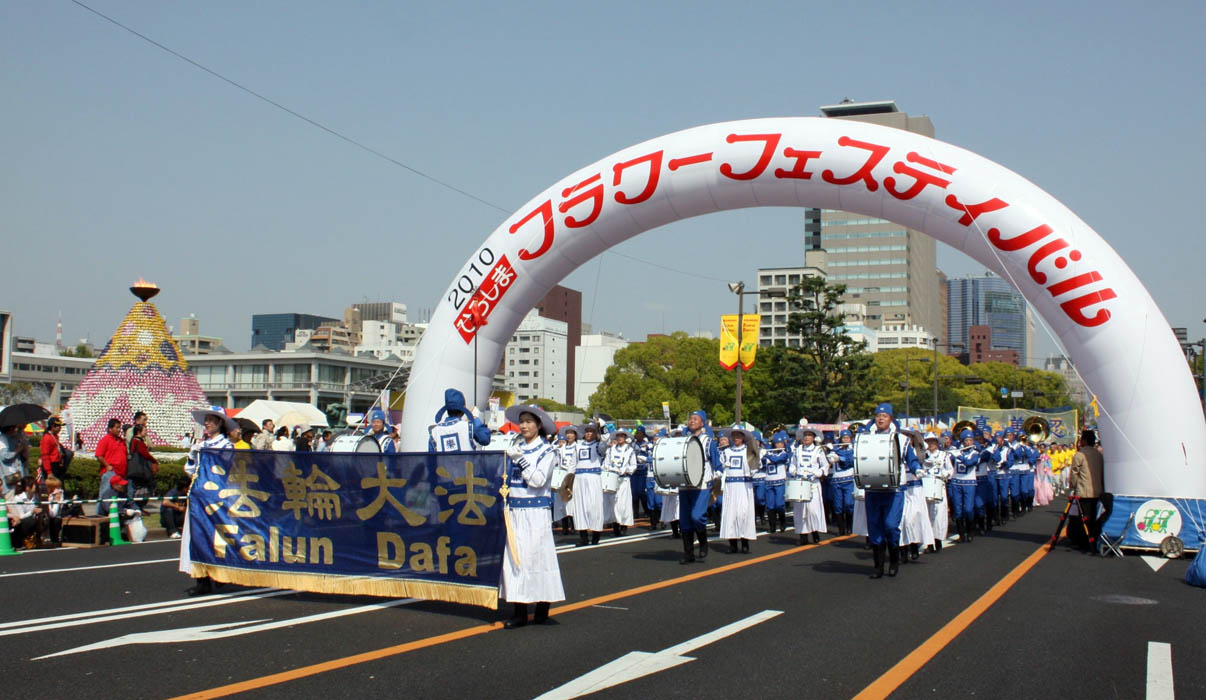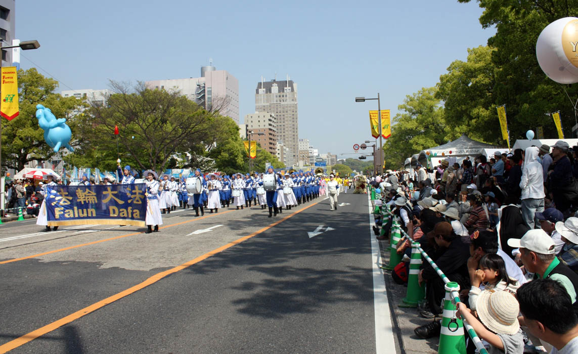 这时,大会组委会的广播里传来了播音员热情的声音:“请看!日本NPO法人法轮大法的队伍走过来了。法轮大法又称为法轮功,是中国传统的修炼方法,法轮功以‘真、善、忍’为修炼指导,作为身心健康的修炼方法广泛受到人们的爱戴。现在,世界上有一百多个国家有法轮功的修炼者。法轮功修炼者们,积极参与各种社区活动,致力于世界的友好与和平……”
