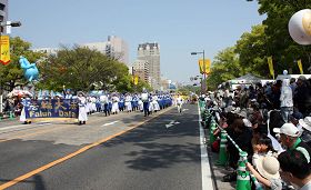 笔者注意到:虽然广岛的市民们早已熟知法轮大法的参与队伍,但当法轮大法的队伍经过时,他们仍象第一次看到一样,脸上泛着震撼、欣羡、敬佩的神情。