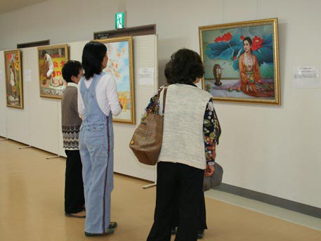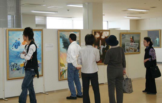 ![]() 日本驹根市民观看“真善忍国际美术展”画作 |