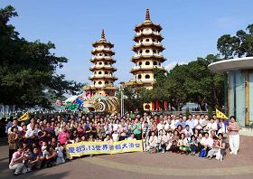 下午北高雄的法轮功学员选择著名风景名胜莲池潭龙虎宝塔,以轻松贴近世人的方式来庆祝大法日,穿着便服炼功、大合唱、分享寿桃、水果、饮料、开放常人参加有奖征答,很多游客也能回答出:法轮功是免费学炼,让人身心健康,家庭和乐,五一三是世界法轮大法日,普天同庆。