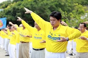 ![]() 高雄法轮功学员演炼法轮功第五套功法神通加持法。 |