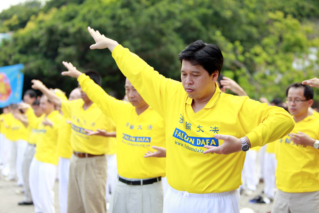 ![]() 高雄法轮功学员演炼法轮功第一套功法佛展千手法。 |