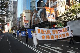 壮观的法轮大法天国乐团在游行队伍前打头阵,《法轮大法好》、《法正乾坤》等演奏曲响彻云霄,紧跟广传《九评共产党》、促“三退”(退党、退团、退队)方阵,将全球三退大潮生动,形象化地表现了出来;随后则是揭露中共迫害法轮功的真相,一辆平板大卡车上的真人酷刑展将中共活体摘取法轮功学员器官牟利、这个星球上有史以来最邪恶的暴行揭露出来,并配备双语同声解说;最后一个方阵是腰鼓队,他们打着欢快的鼓点,使得每一个人都是精神抖擞,神采奕奕。