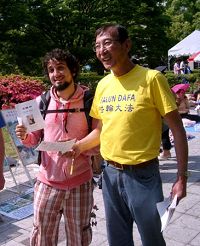 在活动的第二天,一位来自中国山东的留学生,他说是看到了法轮功的横幅特意来的,并说以前在国内,中共迫害法轮功之前,他曾有过一本《转法轮》的书。他问了许多有关法轮功的问题,学员都做了认真的回答并给他介绍了现在的“三退”(退出中共党、团、队)大潮。他说他是党员,在网上看过《九评共产党》,但不是很仔细,问学员有没有《九评》一书。一位学员把自己带的《九评》一书送给了他。他表示回去后要好好看看。学员告诉他在大纪元的网站上可以做三退,祝他好运。他表示感谢。