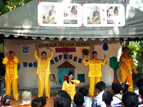六月十八日上午九点半,在庆祝活动开幕式上,泰国法轮功学员代表向主办单位曼谷难民中心、联合国官员致感谢信,对联合国多年来为那些逃离中共残酷迫害的中国法轮功学员提供的帮助和支持表示感谢。演出开始后,身穿金黄色炼功服的法轮功学员首先上台,打开“法轮大法好”的横幅,赢得了观众的掌声。