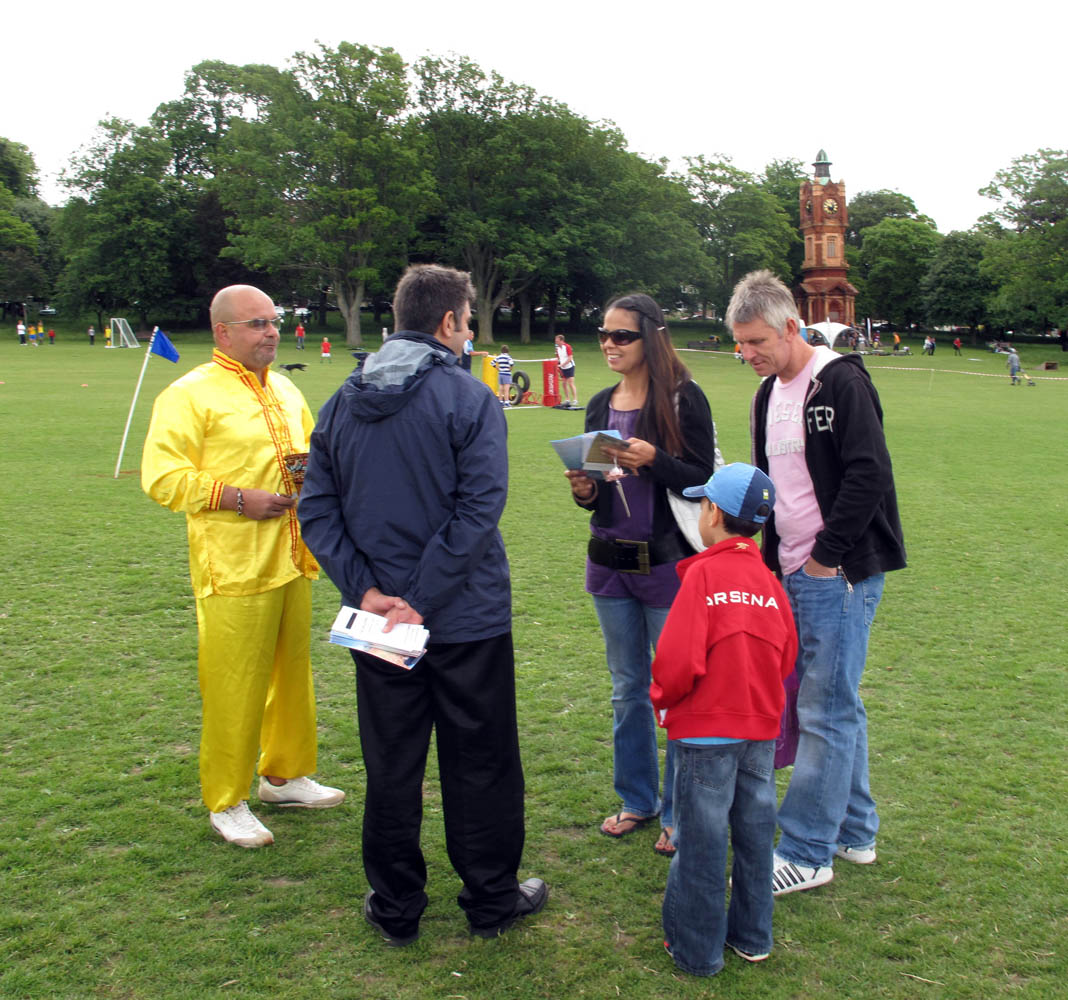 在各类体育项目热闹纷呈的节日参与队伍里,法轮功学员的宁静祥和显得非常突出。学员们用手工莲花装饰的展台看起来清新淳朴,悬挂在展台前面的“法轮大法好”横幅非常令人瞩目。参加当天活动的法轮功学员在整整6个小时里不间断地展示着法轮功五套功法,很多人停下脚步仔细观看学员展示的功法,并认真聆听功法演示录音中对法轮功的介绍,不时有人打听布莱顿当地义务教功点的地址,表示要去学炼法轮功。
