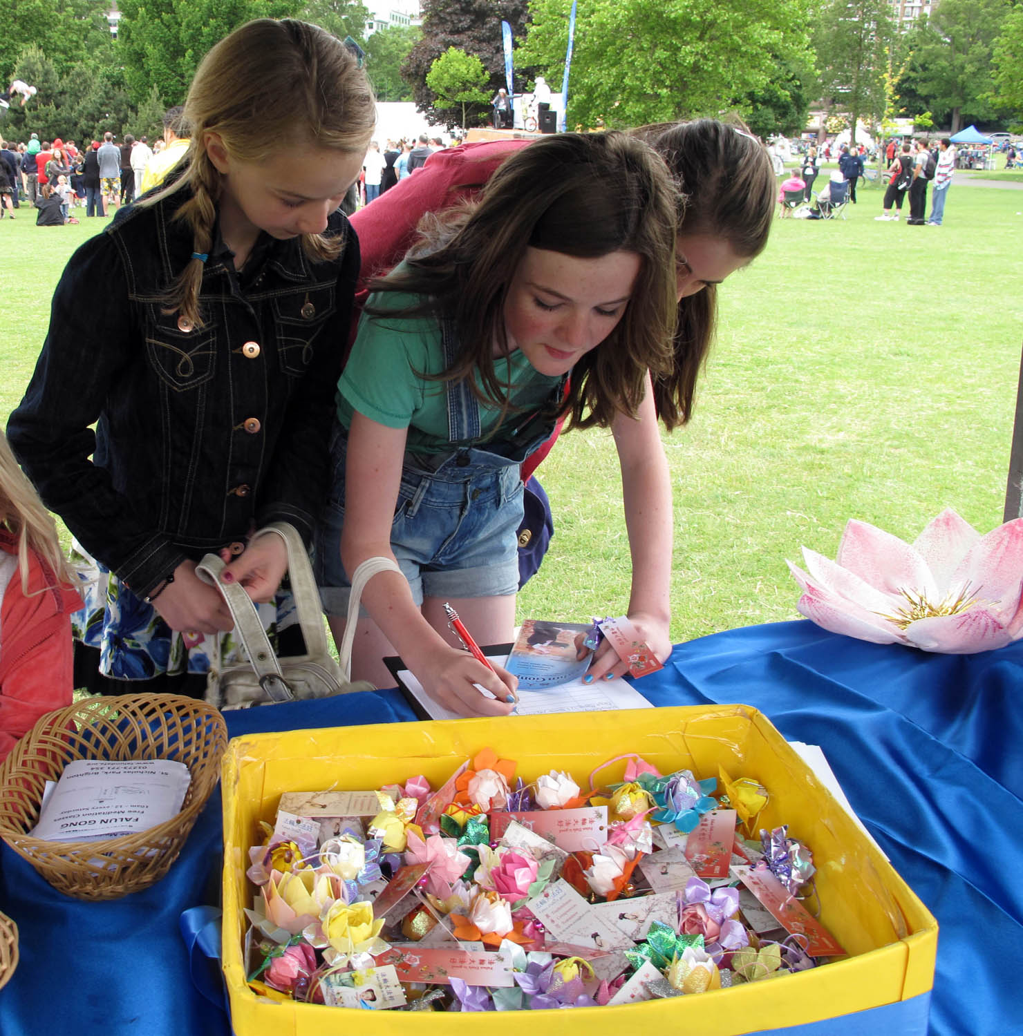 在当天的活动中,法轮功学员还向有缘遇到法轮功的人们发放了近千朵的精美的手工莲花,这些莲花都缀有印着“法轮大法好”和大法网址的图片,得到莲花的人们无论是大人还是孩子都对莲花爱不释手。有三个小姑娘被精美的莲花吸引到展台前,她们是第一次听到法轮功,当学员告诉她们,在中国已有三千多人因为坚持修炼法轮功而被中共迫害致死,她们马上在反迫害征签表上签下自己的名字。