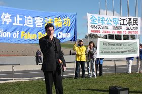 ![]() 澳洲人亚力山大(Alexander Merae)参加集会,表示对法轮功的支持 |