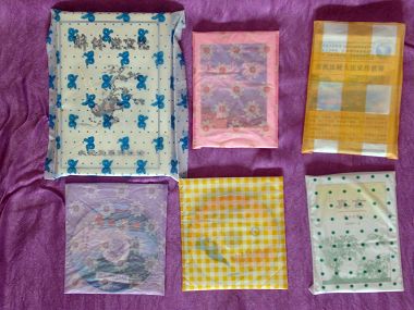 我是从门市部买的每包10张的台桌塑布,花色选用小花而清淡色的。如:淡黄、淡蓝、淡紫、淡粉。制成的包装袋,美观、大方、温馨。每张合1元。做好后的小册子、光盘袋等每个成本只有2――3分钱,《九评》包装袋每个4――5分钱。