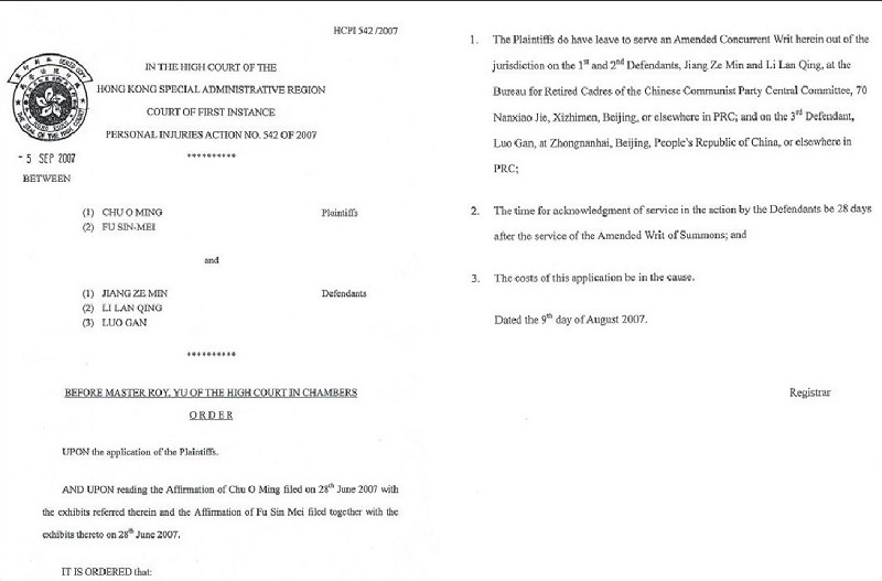 西班牙诉江案的原告辩护律师卡洛斯•伊格雷西雅斯(Carlos Iglesias)于二零零九年十一月十九日证实,西班牙国家法庭向前中共总书记、前国家主席江泽民,及罗干、薄熙来、贾庆林、吴官正五名官员发出传讯令,要求解释对法轮功学员实施活摘器官等群体灭绝行为。