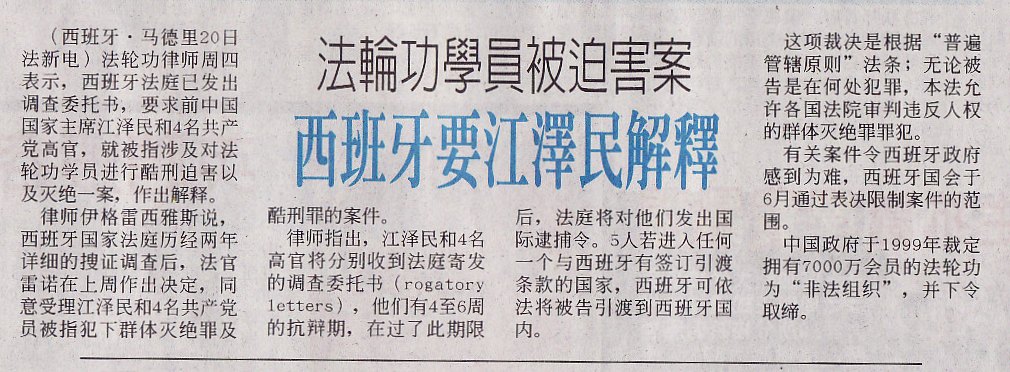 刊登在《中国报》国际版的晚报以及早报以“法轮功学员被迫害案 西班牙要江泽民解释”为标题报道了有关消息。该报道提及法轮功律师周四表示,西班牙法庭已发出调查委托书,要求前中共国家主席江泽民和四名共产党高官,就被指涉及对法轮功学员进行酷刑迫害以及灭绝一案,作出解释。
