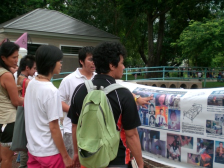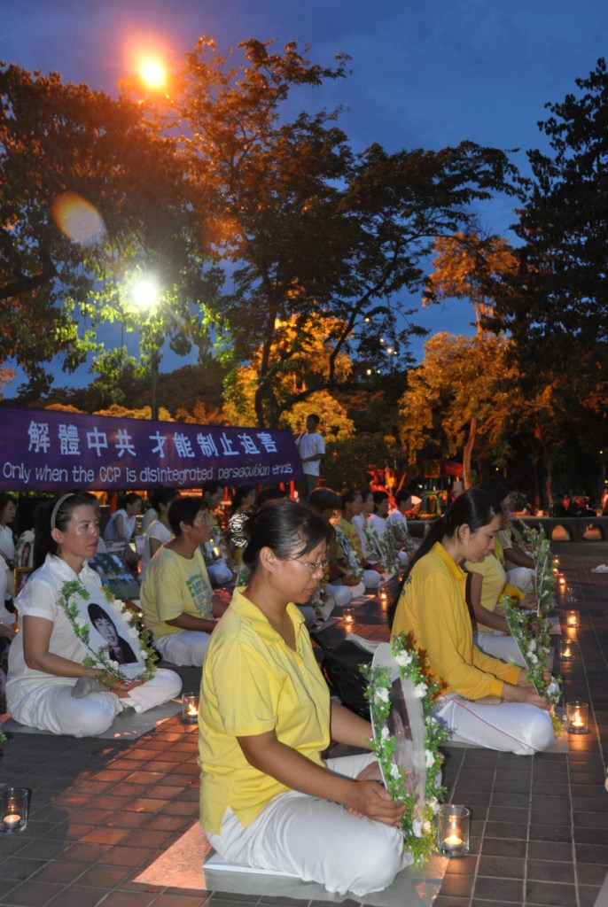 从一九九九年七月二十日至今,中共对法轮功的迫害已长达十一年,法轮功学员坚持和平理性地讲真相,赢得了越来越多的中国民众和国际社会的支持。七月十一日傍晚开始,泰国法轮功学员在曼谷最大的公园——是乐园的一个舞台和草坪上,拉开了“解体中共才能制止迫害”、“声援7600万中国民众退党潮”、“法轮大法好”等横幅,摆放了揭露中共残酷虐杀中国大陆法轮功修炼者、活摘法轮功学员器官、以及介绍大法在世界洪传等真相展板,并集体演示五套功法,举行反迫害和烛光悼念集会。庄严肃穆的场面,使许多游客驻足观看。