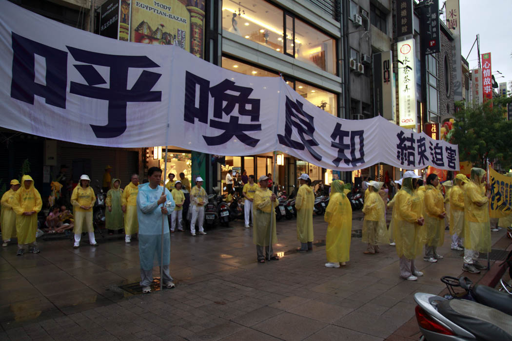 悼念会由法轮功学员组成的唐鼓队击鼓揭开序幕,主办单位表示:“法轮功是一个以‘真、善、忍’作为行为准则的善良团体,有上亿人在学炼,尤其在台湾由几万人增加至今几十万人学炼。许多人因为修炼法轮大法后身体恢复健康,家庭变得和乐,人人在单位上班认真负责,在社会上要求自己做好人中的好人,直接提升了社会道德。一九九九年七月二十日中共发动非法的、残酷的迫害,这完全出自于江泽民对于法轮功的妒忌心,他利用共产党全力发动了这场史无前例,毫无人性的镇压迫害。采用“名誉上搞臭,经济上截断,肉体上消灭”,扬言要在三个月消灭法轮功。如今十一年过去了,法轮功没有被消灭,反而洪传一百一十四个国家和地区,这就证明了法轮大法好。法轮大法普遍受到自由世界国家的欢迎和尊敬。今天在中国大陆,中共持续加重对法轮功的迫害,甚至活摘、盗卖法轮功学员的器官,今天遭受迫害致死的有名有姓的法轮功学员有3397位,成千上万家庭被迫害支离破碎,上百万学员被非法关押、劳教。全世界各地的法轮功学员无论天寒地冻,酷暑日晒,风吹雨打,全年无休地坚持不懈讲清真相。现在越来越多的人明白真相,认识到要制止这场迫害。唯有解体中共,才能停止迫害,人类才有美好的未来。”