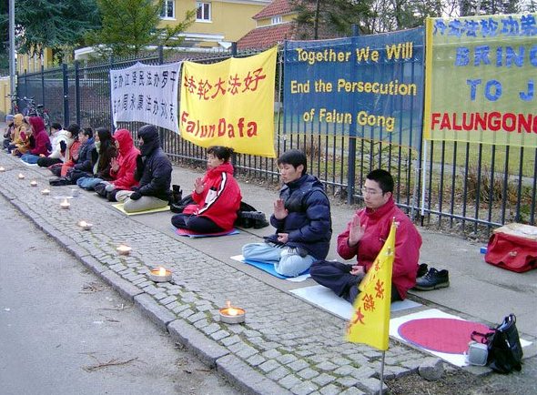 自从九九年七月二十日中共发动了全面迫害法轮功以来,丹麦法轮功学员们从开始不定期地去中使馆抗议迫害,后来成为每天一小时的定期活动。参加的法轮功学员人数不定,有时一、俩人,有时数十人,无论晴天下雨,寒来暑往,从二零零二年四月到现在时间已经走过了八个年头,风雨无阻坚持了超过三千日。