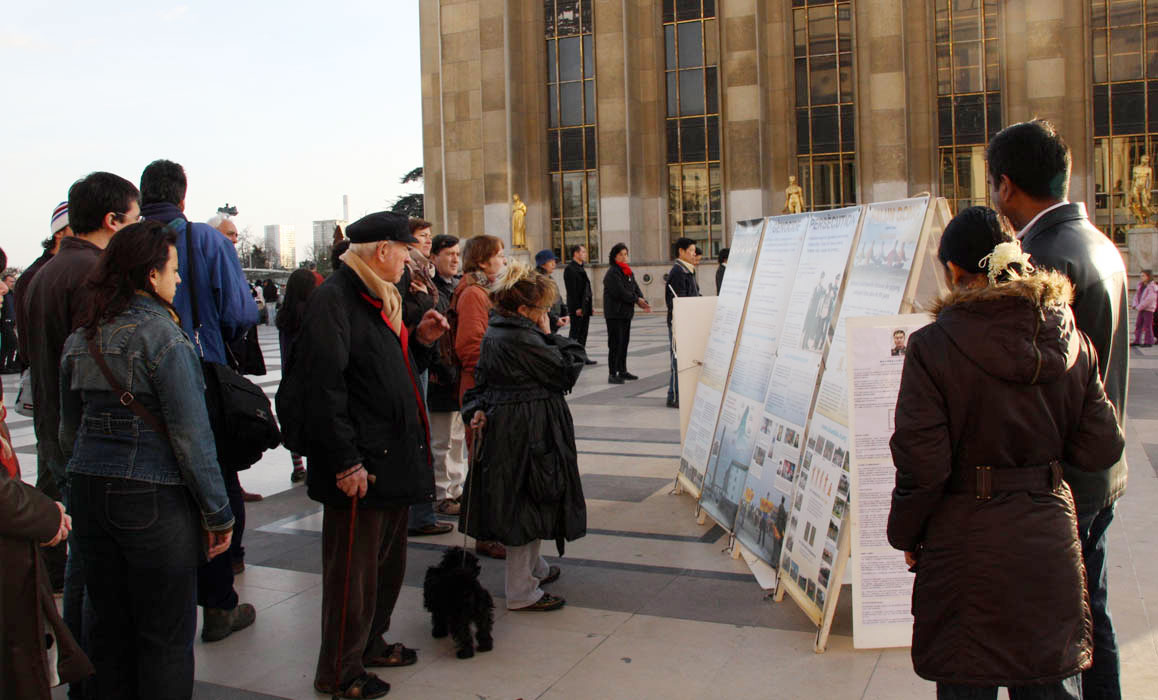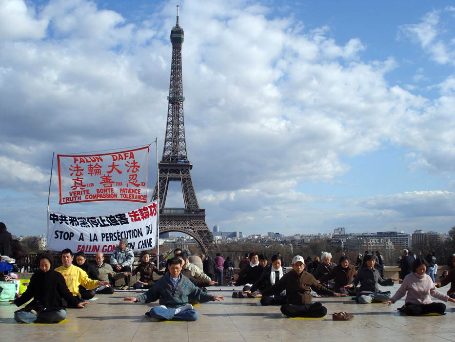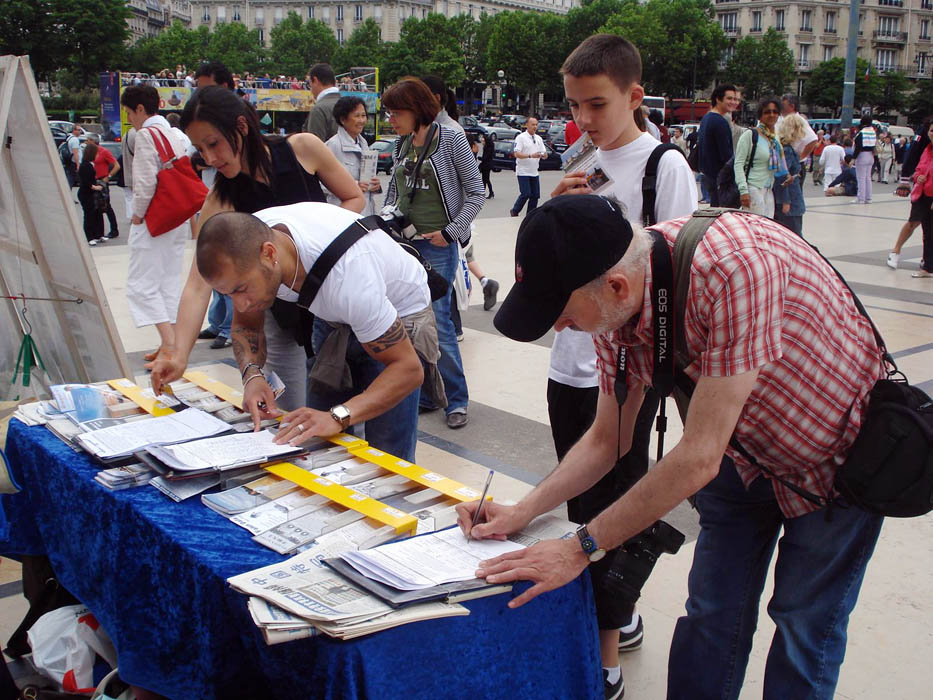 法轮功学员每星期日来到埃菲尔铁塔旁的人权广场,摆放真相展板,炼功、发真相资料和光盘,讲述中国大陆法轮功学员如何以大善大忍的胸怀,面对中共邪恶疯狂的迫害。在中国,这群修炼真、善、忍的人们被非法劳教、判刑、酷刑折磨,甚至被活体摘取器官。中共的行为令人神共愤。了解了迫害详情的人们纷纷在呼吁信上签名,表示对法轮功的支持。