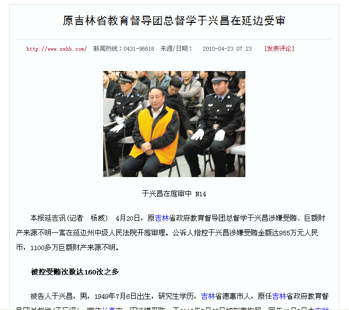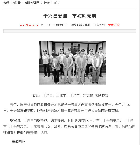 【明慧网二零一零年七月二十一日】二零一零年七月九日,原吉林省教育厅副厅长于兴昌因受贿罪和巨额财产来源不明罪,被延边州中级法院一审判处无期徒刑,剥夺政治权利终身,没收个人全部财产。