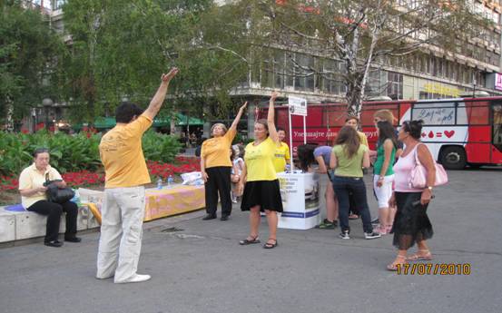 ![]() 塞尔维亚法轮功学员在首都贝尔格莱德市中心举办活动,揭露中共迫害。不少路人当场学炼法轮功。 |