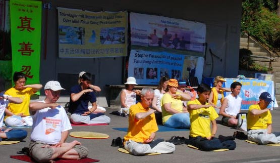 当天中午,法轮功学员来到了中共驻苏黎世领馆对面,打开了写有“法轮大法好”、“真善忍”、“停止迫害法轮功”、“只有解体中共 才能停止迫害”等横幅,同时用德语讲述了中共对法轮功的迫害危害到整个社会。在中国,有的法轮功学员的家属被迫与其离婚,否则就会失去工作。法轮功学员的亲朋好友都会受到牵连。甚至连法轮功学员的同事也会受到诸如扣除工资之类的惩罚,以便他们也帮助当局逼迫法轮功学员放弃自己的信仰。