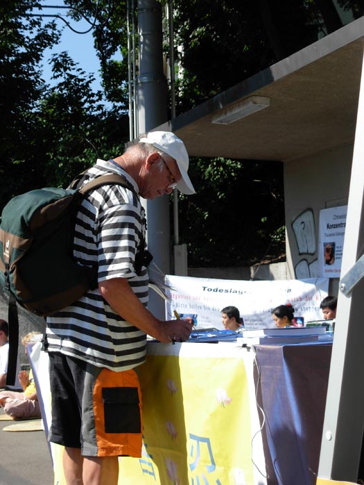 一位视力不是很好的老妈妈在听了阿里亚多讲述了什么是法轮功,以及法轮功学员遭到的迫害后,立即问,我能帮些什么?在阿里亚多为她读了签名表上的内容后,她在呼吁制止迫害法轮功的签名表上写下了自己的名字。
