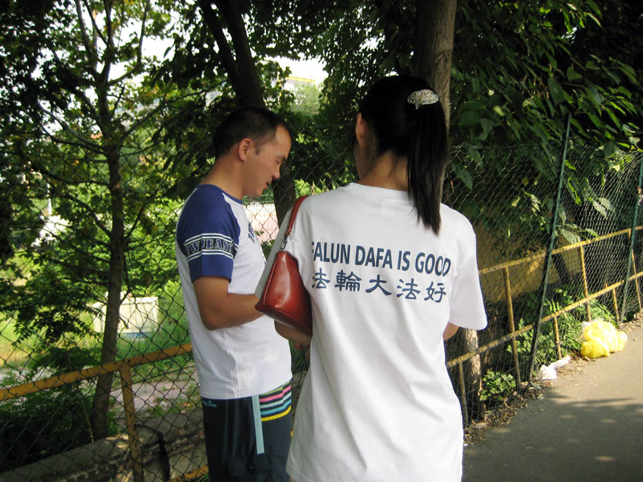 一位法轮功学员对一群刚从中领馆里走出来的华人大声说:“中共对法轮功学员的残酷迫害已经持续了十一年了,善恶有报是天理,天要灭中共了,老百姓赶紧退党保平安”,听到这话,这些人纷纷接过真相传单,脸上露出会心的笑意。有人问,这是真的吗?我回去一定会仔细看的。
