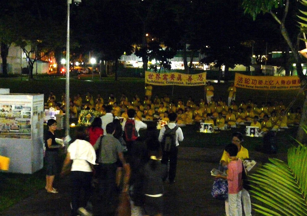 一位从中国来新加坡旅游的男子第一次看到法轮功学员集会的场面震惊不已。学员向他讲述了法轮大法洪传全世界一百一十四个国家和地区、中共的残酷迫害及活体摘取法轮功学员器官牟利等真相。这位男子吃惊地问:“这是真的吗?”学员向他解释中共如何封锁消息,并送给他真相资料。当了解了已经有七千七百多万中国人声明退出中共的党、团、队的大潮后,他表示要退出曾加入的少先队。