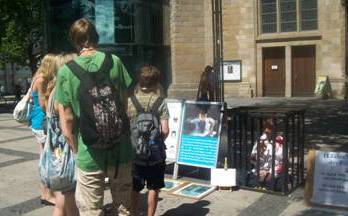 一对德国夫妇和他们的孩子也停下了脚步了解法轮功,并且在签名簿上签了名字。这名德国妇女这几天正心情不好,学员向她介绍法轮功可以解除人的压力,并且炼功可以让人安静下来,是最好的调节身心的方法。她听过之后很感兴趣,准备尝试一下。还有一名德国妇女一直在寻找让心灵安静的方法,见到法轮功学员特别高兴,不断询问这个功怎么炼,在哪里炼等问题,当得到了法轮功的资料后如获至宝。